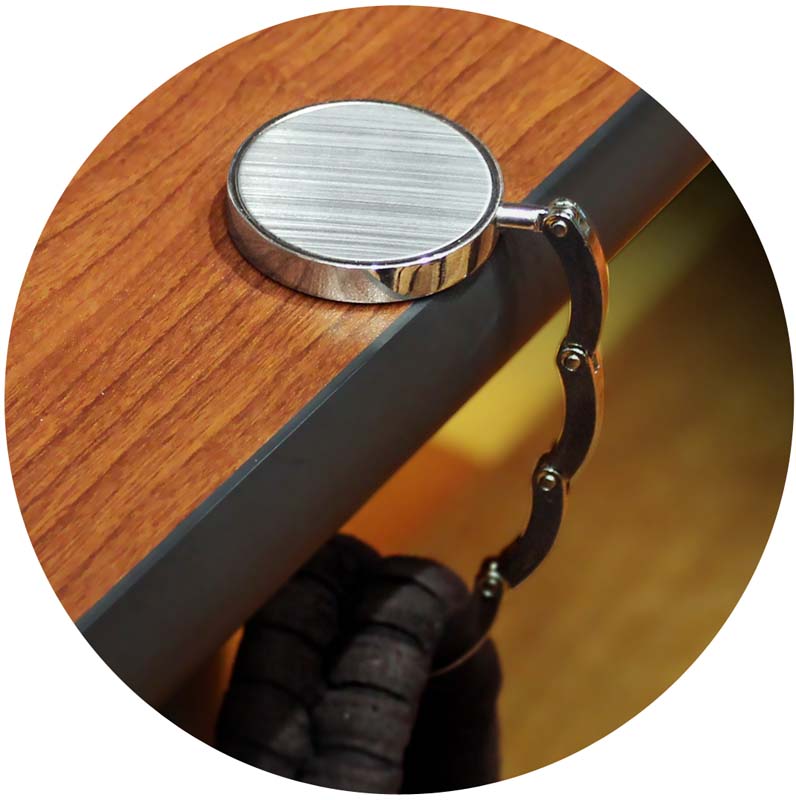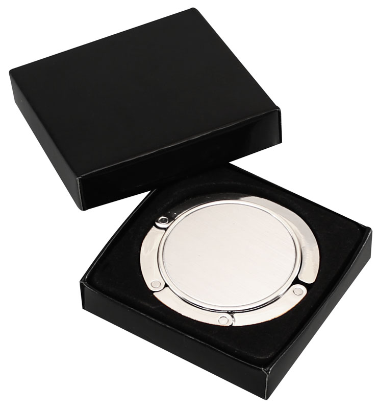 Colgador Metálico Grande de sobremesa para Bolsos y Carteras, modelo “Spiral”. Presentación en estuche laminado negro con cuna aterciopelada.