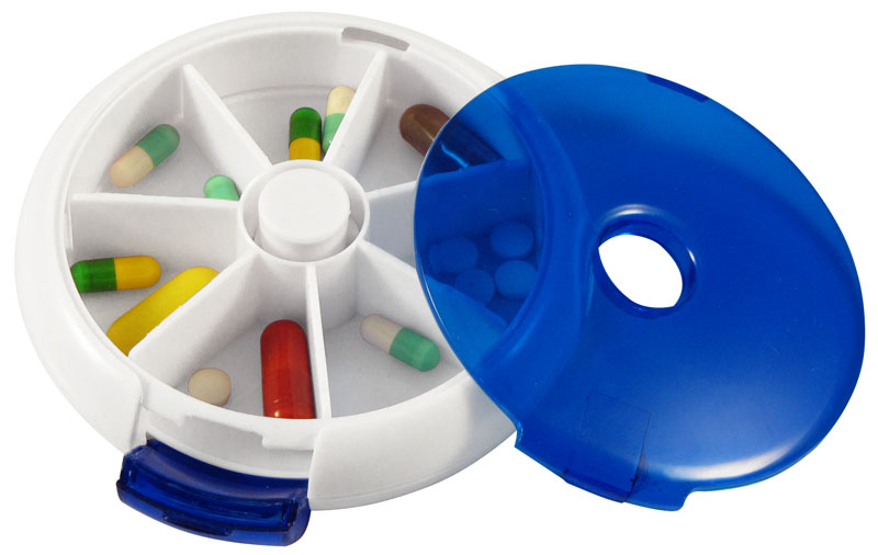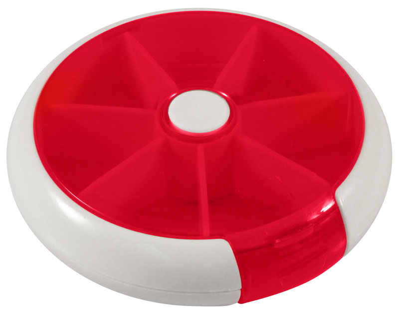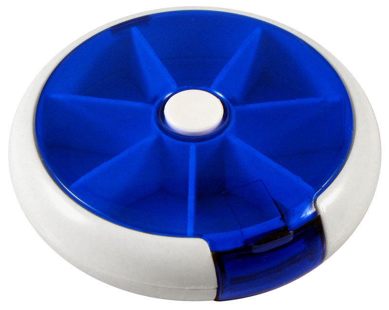 Pastillero Redondo con 7 compartimentos para cada día de la semana. Dispensador automático giratorio. Cubierta de color traslúcido.